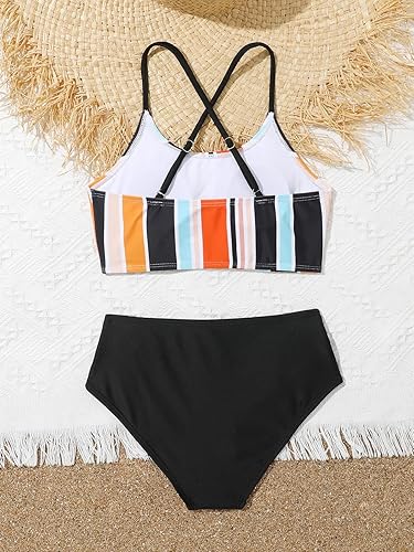 Adjustable straps, criss cross backless, stripe print cami top, high waisted ruched bottom, 2 pieces set