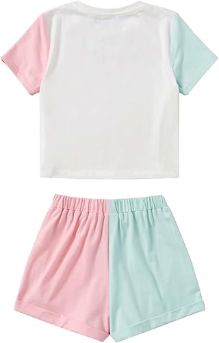 Feature: Heart graphic, color block, crew neck, short sleeve, knot front, roll up hem, casual tees and track shorts, 2 piece outfits for tween girls