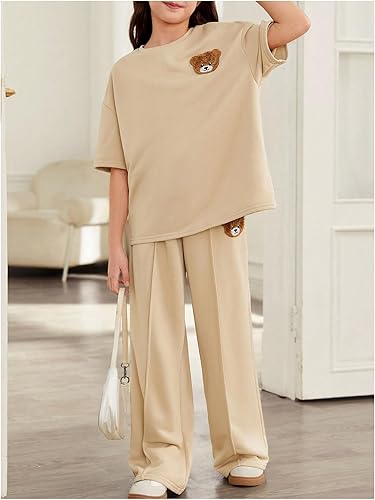 Features: Bear print, drop shoulder, crewneck, top and pants set, loose fit