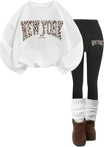 Features: Letter print, cheetah print, long sleeve, crew neck, drop shoulder, 2 piece outfits for girls