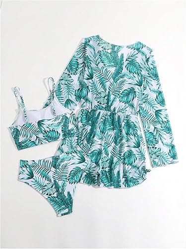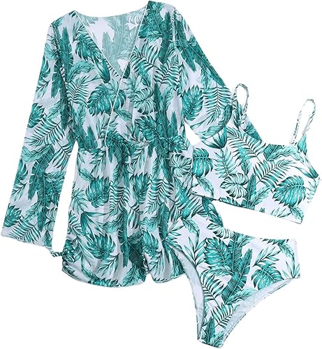 Features: Allover print swimsuit,spaghetti strap bikinis,long sleeve cover up romper,cute 3 piece bathing suit