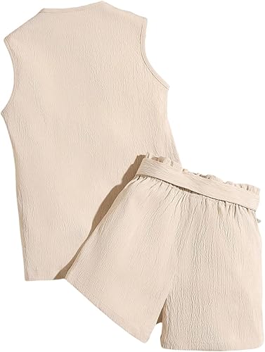 Features: Sleeveless, open front, lapel collar, wide leg, elastic waist, belted, solid color, 2 piece outfits for girls