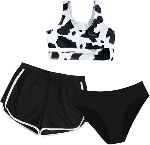 Teen Girl Swimsuit 3 Piece Tankini Bathing Suits for Girls Bikini with Shorts Cow Print Cute (2-Black, 13-14 Years)