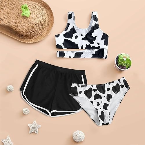 Teen Girl Swimsuit 3 Piece Tankini Bathing Suits for Girls Bikini with Shorts Cute Cow Print Kids Swimsuit Swimwear(1-black,10-12 Years)