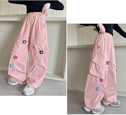 Teen Girls Flower Embroidery Cargo Pants Wide Leg Elastic High Waist Joggers Cute Stylish Trousers for Kids School Pants(Pink,5-6 Years)