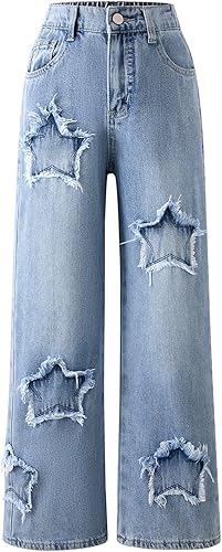 Teen Girls Jeans Star Decoration Elastic Waist Wide Leg Casual Denim Loose Fit Straight Denim Trouser for Autumn(Light Blue,13-14 Years)