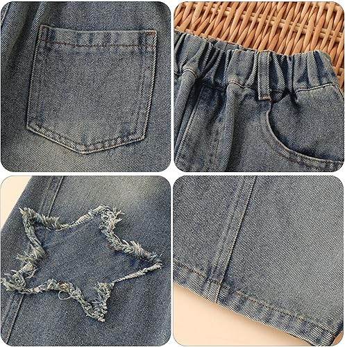 Teen Girls Star Embroidered Jeans Baggy High Elastic Waist Soft Denim Pants Trendy Ripped Streetwear Trousers(Blue,5-6 Years)