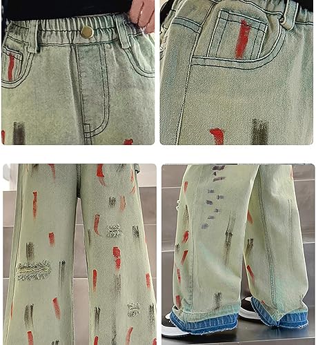 Teen Girls Stylish Graffita Ripped Jeans Wide Leg Elastic High Waist Streetwear Denim Pants Jeans Y2k Clothes Trousers(Light Blue,11-12 Years)