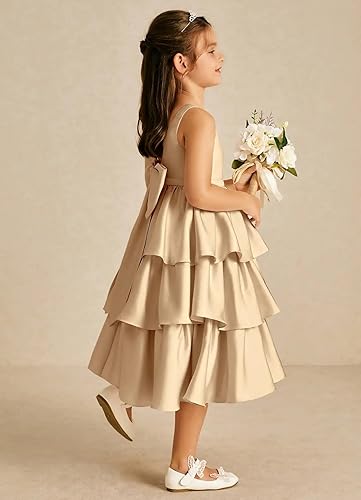 Make this Satin flower girl dress a stunning element of a bridal party.Dress at its adds a tiered detail adds a tasteful touch, and a back bow and circle skirt round out sophisticated design details.