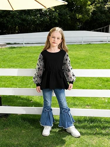 Unique Western-Inspired Design:Standout **girl’s western outfit** with **sheer floral mesh sleeves**, a **waist bow detail** on the peplum top, and **flared jeans** adorned with bow accents and frayed hems. The elastic-waist jeans offer a customized fit, while the elegant peplum silhouette and floral sleeves add charm. A perfect blend of cowgirl style and modern fashion, making your little one shine on any occasion.