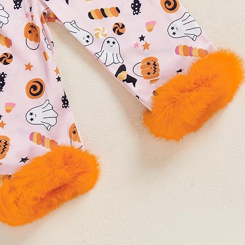 Feature: Toddler girl pajamas, Pumpkin/ghost print, furry cuffs, Long sleeve, lapel collar, button down silk shirt with long pants. baby halloween sleeper, halloween pjs baby and toddler, ghost baby pajamas, toddler winter pajamas, toddler pajamas girls