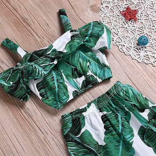 Feauter:Halter green tank tops,trendy big banana leaf print, strappy off shoulder crop top with wide straps, flawy midi skirt with ruffled hem, stylish and elegant for little girls
