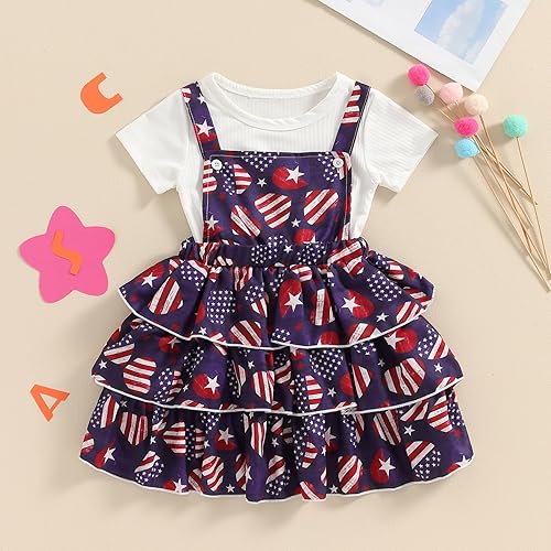 QUALITY MATERIAL: Toddler girl 4th of july outfit, independence day summer dress set. Tops is made with 95% cotton&5% elastane, overalls skirts is made of 95% polyester&5% elastane, the girls skirts set is designed to keep your little ones cool and comfortable during the hot summer months.