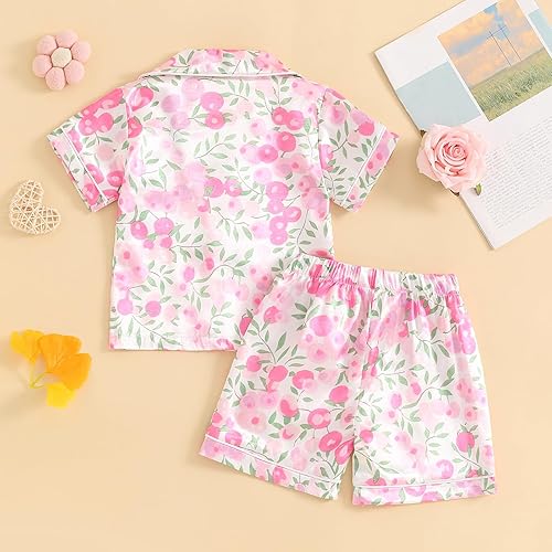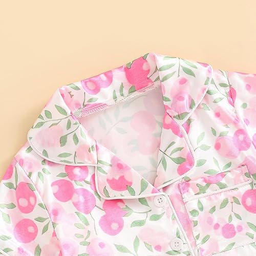 Feature: pajamas for girl is loose fit,floral print,short sleeves,v neck,button closure,turn down collar and with elastic waistband,pretty and fashionable,can make your baby more cute and get more compliments