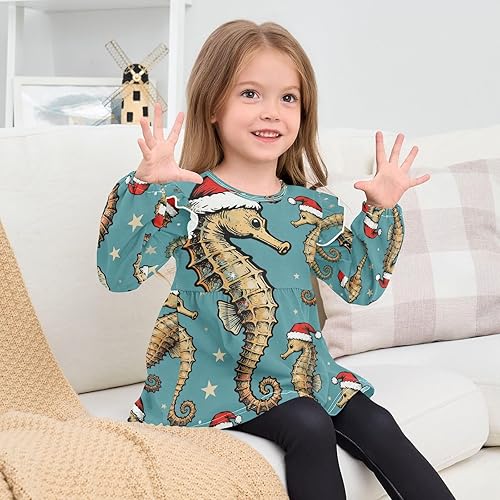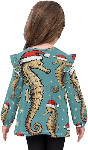 Toddler Girl Long Sleeve Shirt Ruffle Kids Blouse Tops Tee Shirt 18M-5T(Seahorse Wearing Santa Hat,4T)