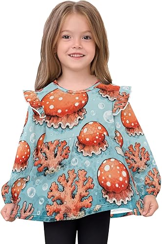 Toddler Girl Long Sleeve Shirt Ruffle Kids Blouse Tops Tee Shirt 18M-5T(Coral Jellyfish Bubbles Seashells Ocean,5T)