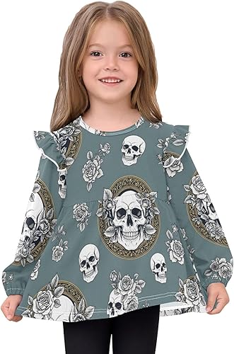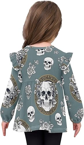 Toddler Girl Long Sleeve Shirt Ruffle Kids Blouse Tops Tee Shirt 18M-5T(Skull Roses Floral,3T)