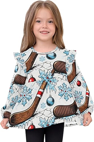 Toddler Girl Long Sleeve Shirt Ruffle Kids Blouse Tops Tee Shirt 18M-5T(Hockey Sticks Snowflakes Ice,2T)
