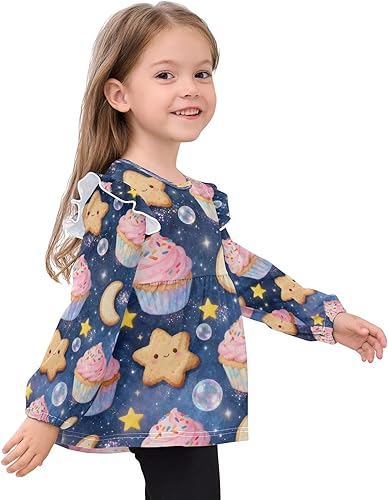 Toddler Girl Long Sleeve Shirt Ruffle Kids Blouse Tops Tee Shirt 18M-5T(Cupcakes Stars Moons Bubbles Night,18 Months)
