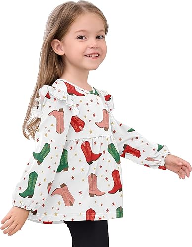 Toddler Girl Long Sleeve Shirt Ruffle Kids Blouse Tops Tee Shirt 18M-5T(Cowboy Boots Stars Red Green,18 Months)