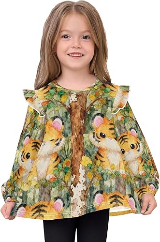 Toddler Girl Long Sleeve Shirt Ruffle Kids Blouse Tops Tee Shirt 18M-5T(Cute Tiger Forest Watercolor,18 Months)