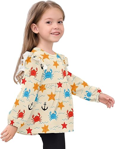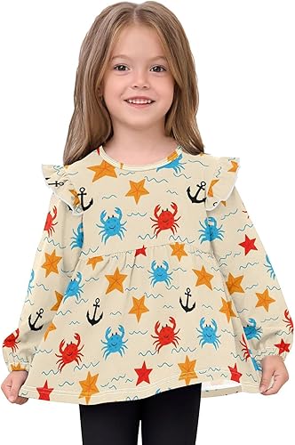Toddler Girl Long Sleeve Shirt Ruffle Kids Blouse Tops Tee Shirt 18M-5T(Crabs Stars Anchors Waves Sea,18 Months)