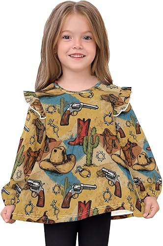 Toddler Girl Long Sleeve Shirt Ruffle Kids Blouse Tops Tee Shirt 18M-5T(Cowboy Hats Cacti Boots,3T)