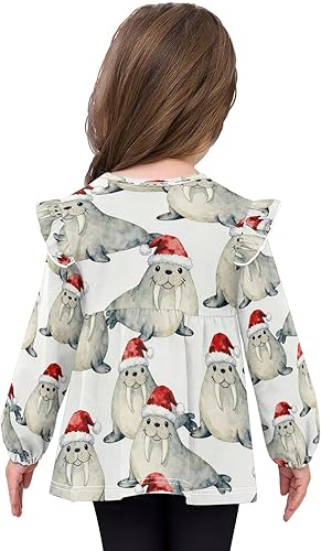 Toddler Girl Long Sleeve Shirt Ruffle Kids Blouse Tops Tee Shirt 18M-5T(Walrus Wearing Santa Hats,18 Months)