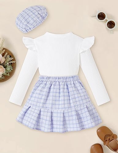 Toddler Girl Outfits Ruffled Long Sleeve Top Plaid Tweed Skirt and Beret Set Fall Winter Girls Clothes Size 3-8(White-blue,3-4T)