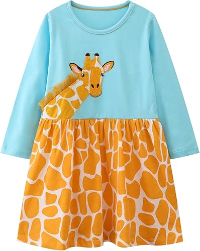 Stylish Design:A trendy casual dress for little girls,featuring exquisite prints of cute unicorns, rainbows,giraffes,and Santa Claus—lovely and fashionable.It comes with a rotating ruffled hem,an A-line silhouette,a knee-length cut,and a round neck design,making it a favorite among every little girl.