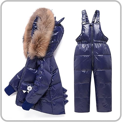 Toddler Heavyweight Snowsuits Girls Boys 2 Piece Winter Warm Ski Sets Hooded Puffer Jacket & Snow Bib Pants(Dark Blue,1T)