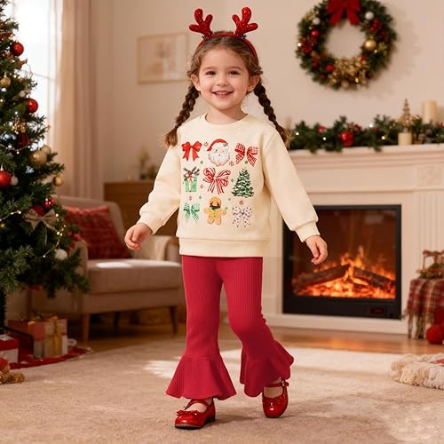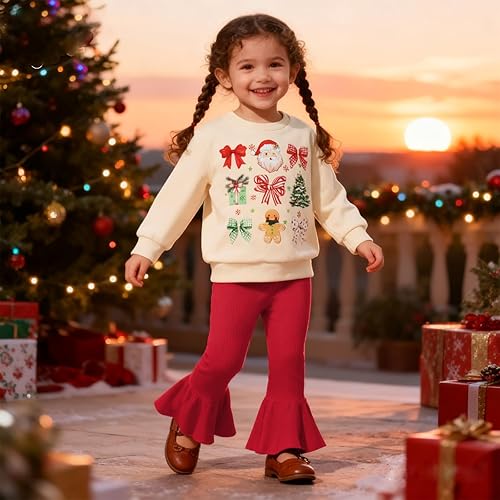 Design: Baby girl christmas sweatshirt features Candy Cane/Santa Claus/Christmas Tree/Bow print, round neck, long sleeve, match with solid color bell bottom pants. After wearing christmas toddler girl outfit, your little one will receive a lot of compliments.
