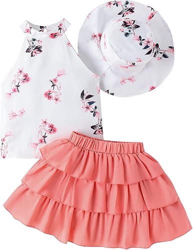 Design: Little girl vacation skirts sets, sleeveless flower print tops, elastic waist ruffled dress, pink cake skirt, sun hat, 3 pieces baby girl beach clothes, your little sweet heart will fall in love with this outfits on it!