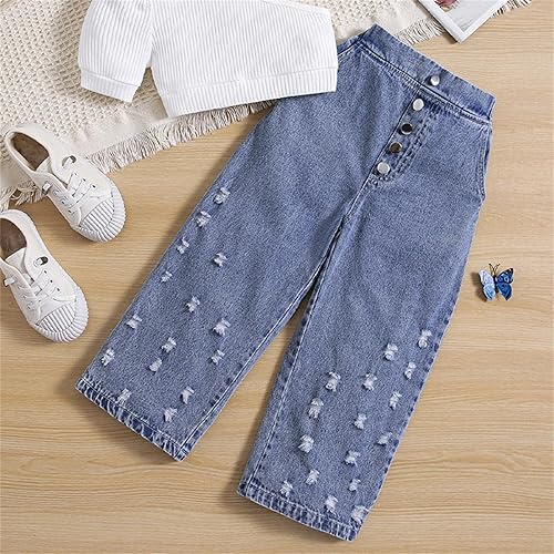 Features: Baby girl denim pants, elastic waist, classic blue color, ripped detail, side pockets, straight wide leg long pants, button closure, girls going out pants, your little baby will love it