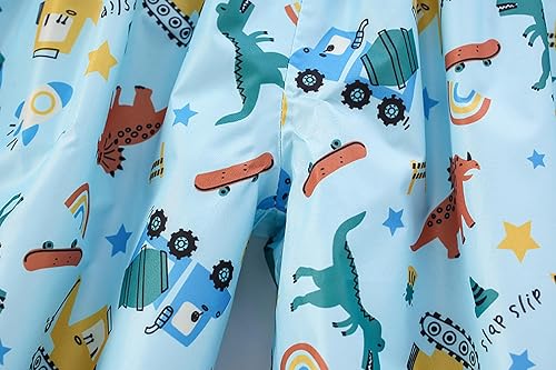 MATERIAL: kids dinosaur rain pants made from high quality waterproof polyester solid fabric,kids can shake off the water droplets by gently shaking,it is durable to protect your children from any bad rainy,windy and snow days, and easy to clean, if there is only a slight stain, take a wet towel to wipe.