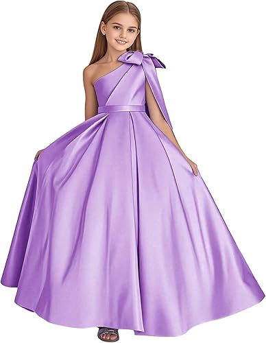 Features: One Shoulder, Satin, Zipper Back, Poofy, Puffy, with Bow, A Line, Floor Length, Sleeveless. Toddler Princess Satin Flower Girl Dress Ball Gown Dress for Girls One Shoulder First Holy Communion Dress for Girls Pageant Princess Dress Kids Flower Girl Dresses for Wedding