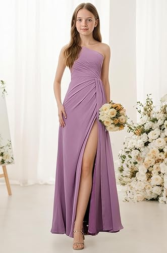 Junior Bridesmaid Dresses Features: A Line Junior Bridesmaid Dresses for Teen Girls, Chiffon Flower Girl Dresses for Wedding, One Shoulder, with Slit, Sleeveless, Floor Length Teens Formal Dress, A Line, Plus Size, Lace up Back/Corset, fully lined make it comfort to wear