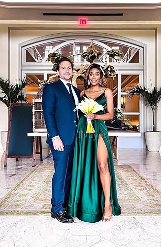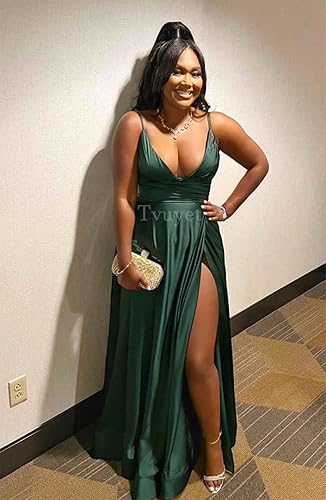 Feature: Satin Prom Dress with Slit, Deep V Neck, Banded Hemline, Adjustable Spaghetti Strap, Front Ruched, Corset Back, Floor Length, A-Line, Sleeveless, High Split, Built-in Bra, Plus Size Available,Custom Sizing is Available.