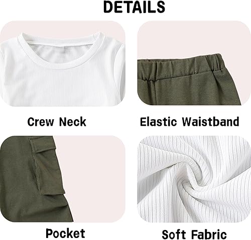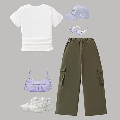Trendy Fall Look: Ribbed ruched T-shirt top paired with cargo pants creates a fashionable, on-trend outfit for stylish tween and teen girls.
