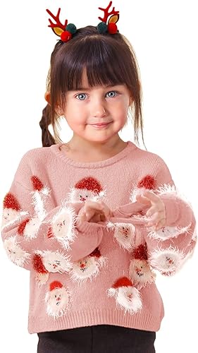 Ugly Christmas Sweater Kids Fall Cute Santa Claus Print Knitted Sweaters Girls Christmas Oversized Crew Neck Sweatshirt(Pink,3-4T)