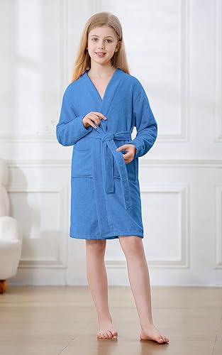 Umeyda Boys Girls Towel Robe Soft Terry Cloth Cotton Kimono Bathrobes for Kids, Dark Blue, 11-12 Years