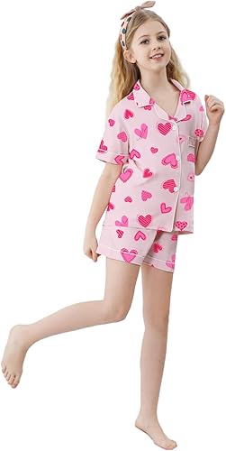 Umeyda Girls Pajamas Set Soft Short Sleeve Button-Down Sleepwea Nightwear 3Pjs Set Loungewear, 5-14 Years(Pink Heart,13-14 Years)