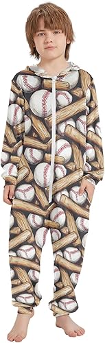 Unisex Kids Jumpsuits Baseball Bats Pattern Warm Fuzzy Hooded Rompers for Boys and Girls(Multicolor,13-14 Years)