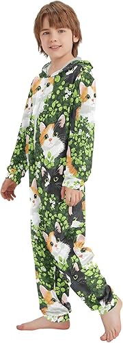 Unisex Kids Jumpsuits Cat Hidden in Green Leaves Pattern Warm Fuzzy Hooded Rompers for Boys and Girls(Multicolor,4T)