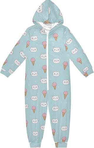 Unisex Kids Jumpsuits Cat Ice Cream Pattern Warm Fuzzy Hooded Rompers for Boys and Girls(Multicolor,12-13 Years)