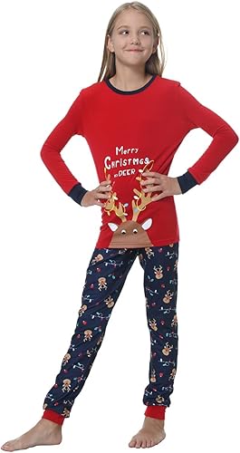 Unique Christmas Pajama Set-This matching family pajama set features a classic Christmas deer print with a red long-sleeved top and black printed pants, making these sleepwears perfect for Christmas celebrations.