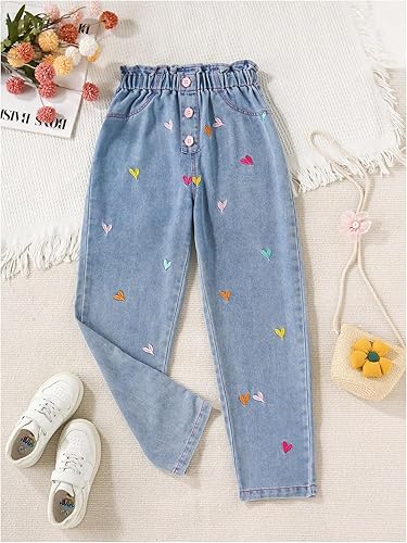 Casual jeans, kawaii clothes, spring fall clothes, embroidered, graphic pattern, high rise, elastic waistband, tapered leg, loose fit