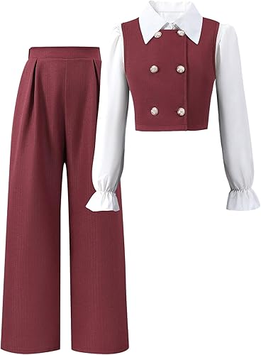 Collared Neck, Long Sleeve, Elastic Waist, Straight Leg, 3 Pieces Elegant Clothing Set for Tween Girls
