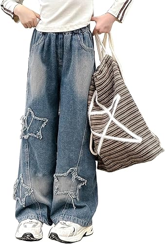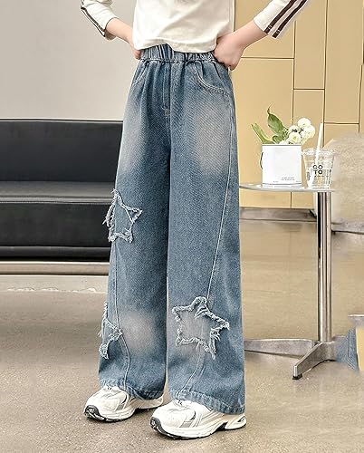 Design: Girls baggy jeans feature with trendy star printed, wide leg style, y2k printed jeans, pull up wide leg jeans for girls, girls elastic waist jeans size 6 are easy for you to put on or take off, no zipper or button fly