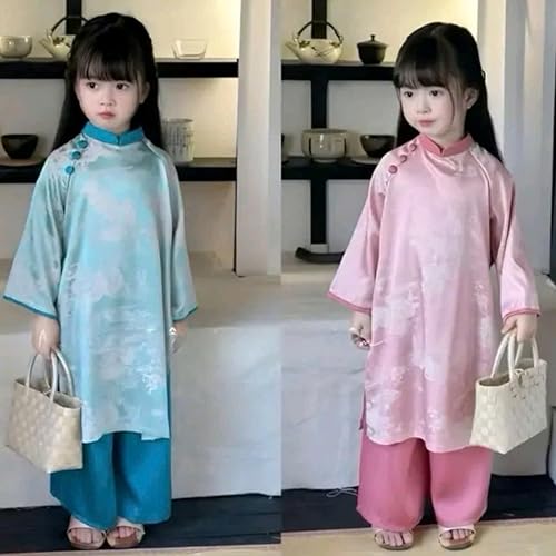 Ao Dai with round neck, loose fit, novel design, long sleeves, fashionable color ao dai combined with pants, elastic waistband, comfortable for baby